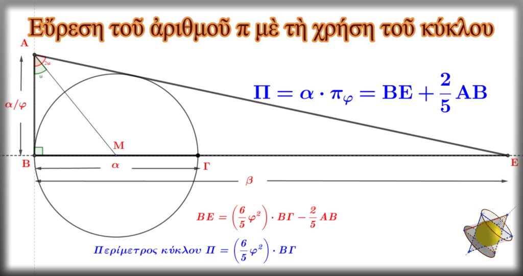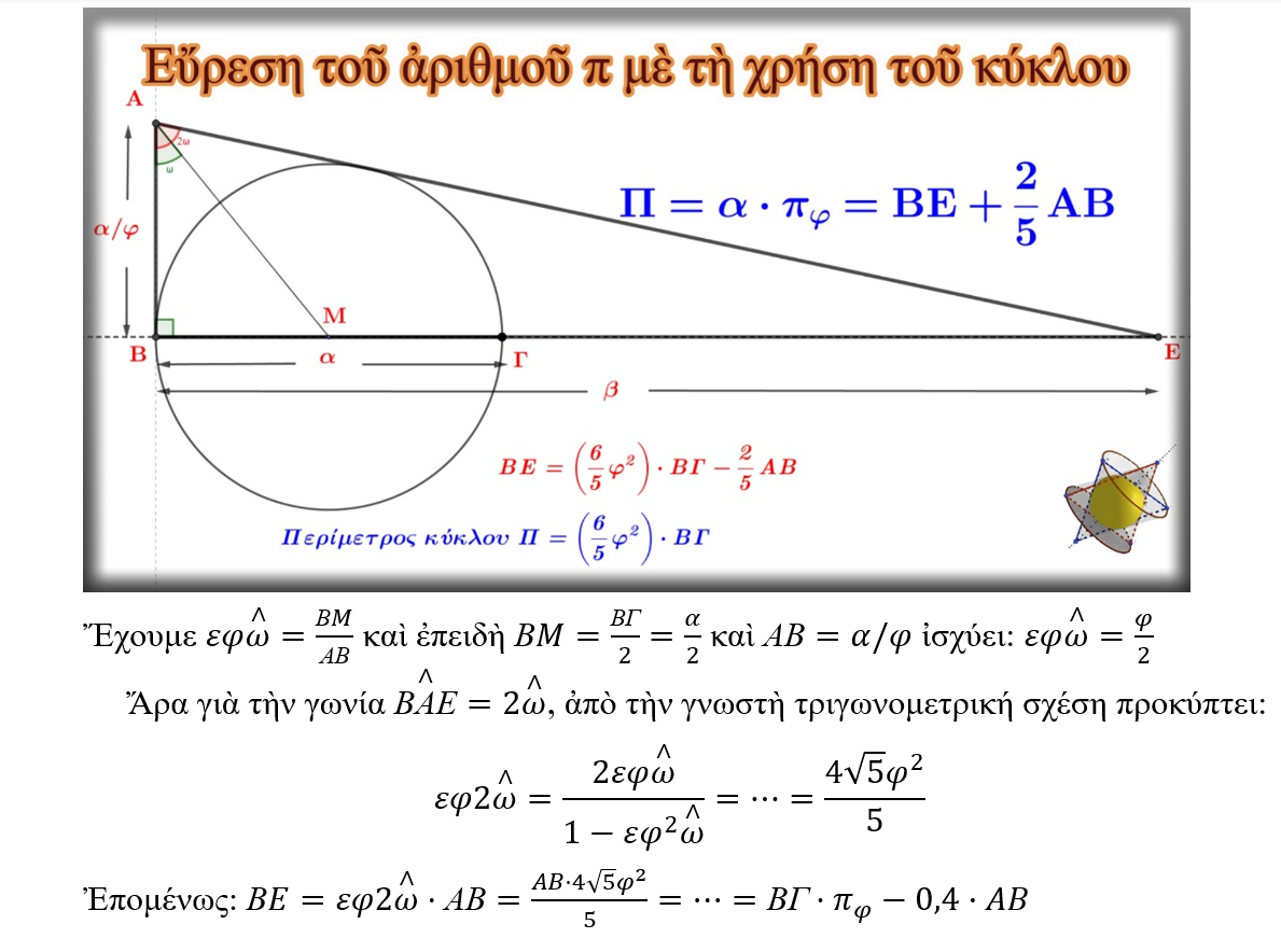 Ἀποδεικνύεται (ἐδῶ), πὼς ΒΕ=ΒΓ·(6/5·φ²)-2/5·ΑΒ  καὶ ἐὰν θεωρήσουμε ὅτι 6/5·φ²= πφ =π, τότε   ΒΓ·(6/5·φ²) εἶναι ἴσο μὲ τὴν περίμετρο τοῦ συγκεκριμένου κύκλου Π, ὁπότε :
