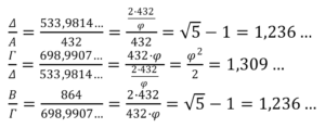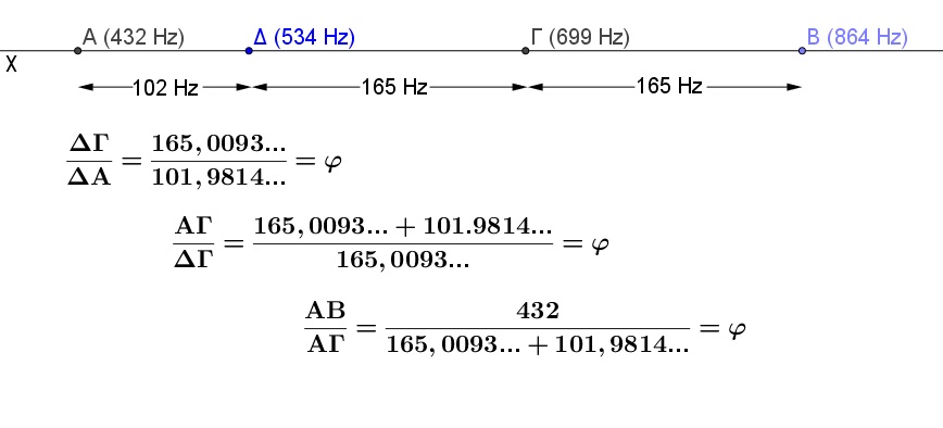 Ὅπως γνωρίζουμε, στὴν μουσικὴ καὶ γιὰ τὶς νότες δὲν μᾶς ἐνδιαφέρουν οἱ τιμὲς τῶν συχνοτήτων αὐτούσιες, ἀλλὰ ἡ σύγκριση τους, οἱ ἀναλογίες τους. Θέλουμε νὰ βροῦμε ποιὲς συχνότητες θὰ προκύψουν μὲ λόγο ἴσο μὲ τὸν ἀριθμὸ φ, σὲ σχέση μὲ τὴν ἀρχὴ καὶ τὸ τέλος τῆς κλίμακάς μας, δηλαδὴ σὲ σχέση μὲ τὶς τιμὲς τῶν 432 Hz καὶ 864 Hz . Θὰ θυμηθοῦμε ὅτι: