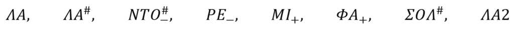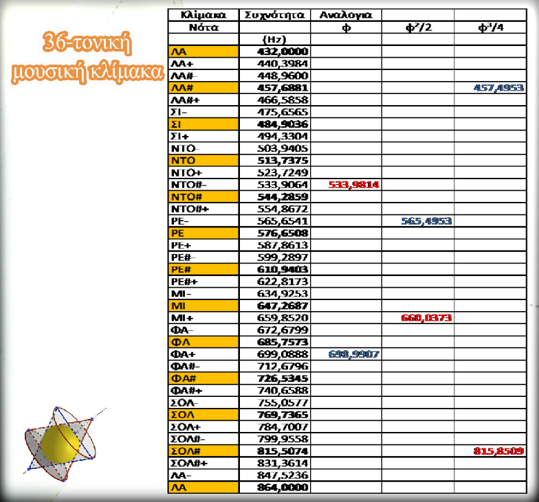 - ἐπίσης δύο νότες ποὺ προκύπτουν ἀπὸ τὶς ἀρχικές, μὲ λόγους συχνοτήτων τὸν ἀριθμὸ φ, τὴν ΝΤΟ#–(534) καὶ τὴν ΦΑ+(699),