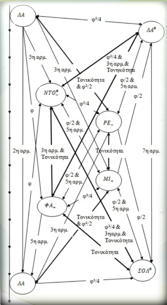 - καὶ τέλος, δύο νότες ποὺ προκύπτουν ἀπὸ τὶς ἀρχικές, μὲ λόγο συχνοτήτων ἴσο μὲ κλάσμα τοῦ φ3/4, τὶς νότες ΛΑ#(458) καὶ ΣΟΛ#(816).