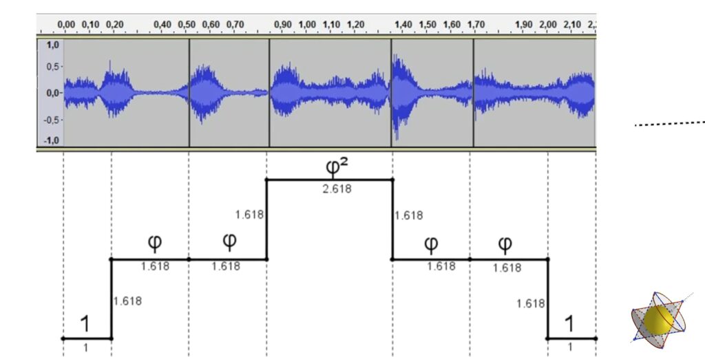 Τὸ μέτρο ξεκινάει μὲ τὴν μικρότερη χρονικὴ ἀξία στὴν ὁποία δόθηκε ἡ τιμὴ 1. Ἡ ἑπόμενη χρονικὴ ἀξία, συγκρινόμενη με τὴν ἀρχική, βρέθηκε ἴση μὲ τὴν τιμὴ φ, ὅπως καὶ αὐτὴ ποὺ ἀκολουθεῖ. Στὴ συνέχεια ὑπάρχει ἡ μεγαλύτερη σὲ διάρκεια ἀξία ἡ φ². Τὸ μέτρο ὁλοκληρώνεται μὲ μία ἀντίστροφη καὶ φθίνουσα πορεία, θὰ μπορούσαμε νὰ ποῦμε σὲ πυραμιδικὴ διάταξη.