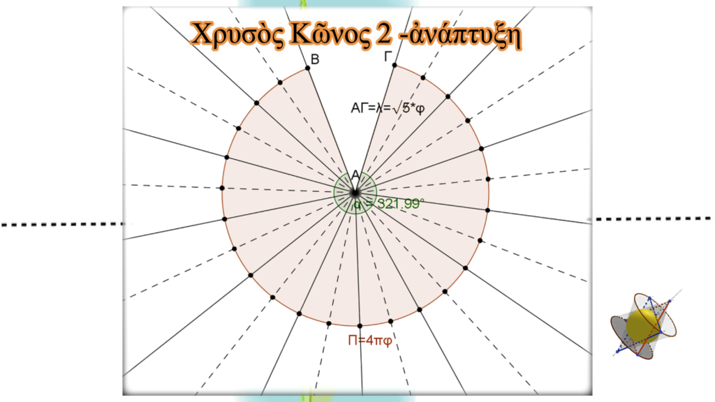 Ἡ περίμετρος τοῦ τόξου ΒΓ εἶναι ὅση καὶ ἡ περίμετρος τοῦ κύκλου τῆς βάσης τοῦ μουσικοῦ κώνου καὶ ἰσοῦται μὲ : Π=4πφ