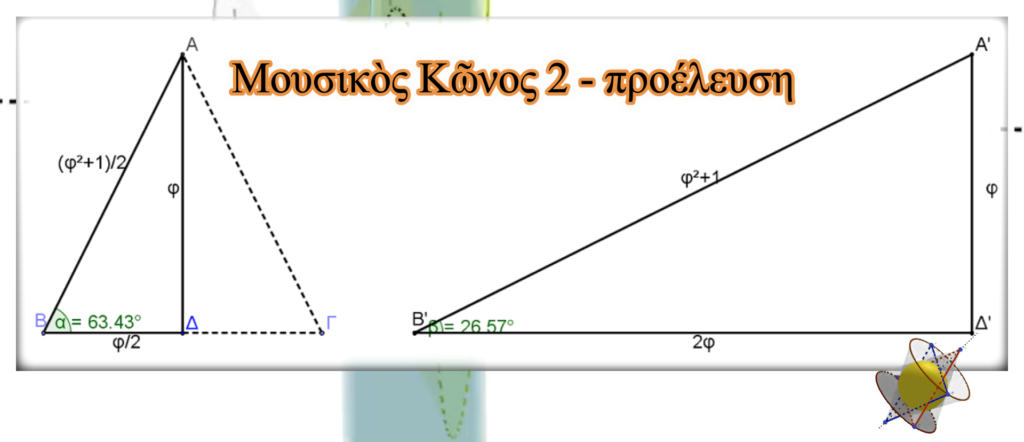 Ὅπως εἴδαμε, ὁ μουσικὸς κῶνος στηρίζεται στὸ Χρυσὸ Τρίγωνο (ΑΒΓ) ὅπου τὸ ὕψος (ΑΔ) πρὸς τὴ βάση του εἶναι ἴσο μὲ τὴν βάση (ΑΔ). Αὐτό, χωρίζει τὸ Χρυσὸ Τρίγωνο σὲ δύο ἴσα μεταξὺ τούς ὀρθογώνια τρίγωνα. Ἐὰν τὸ ὕψος ΑΔ εἶναι ἴσο μὲ φ, τότε ἡ ἄλλη κάθετη πλευρὰ θὰ εἶναι ἴση μὲ φ/2, ἐνῶ ἡ ὑποτείνουσα ὑπολογίζεται καὶ βρίσκεται ὅτι ἰσοῦται μὲ ΑΓ=(φ2+1)/2