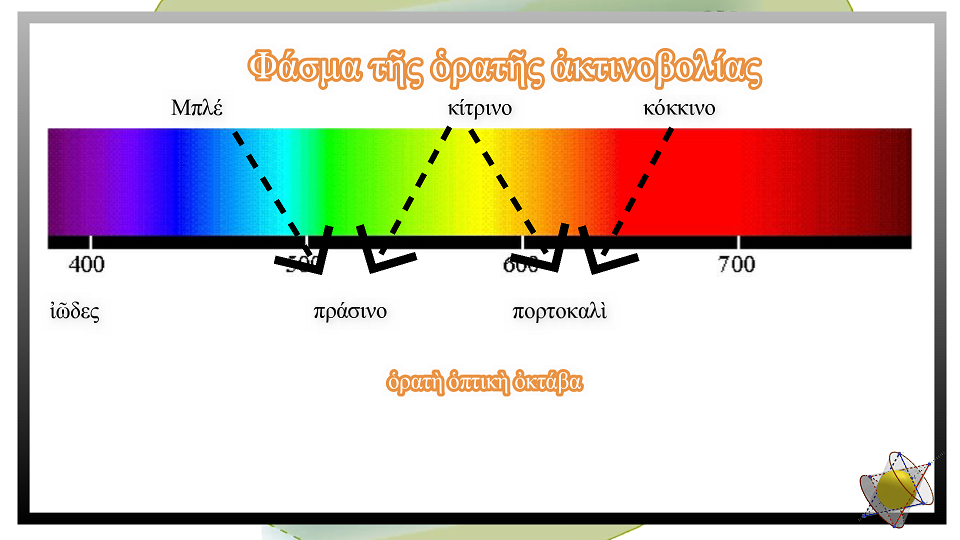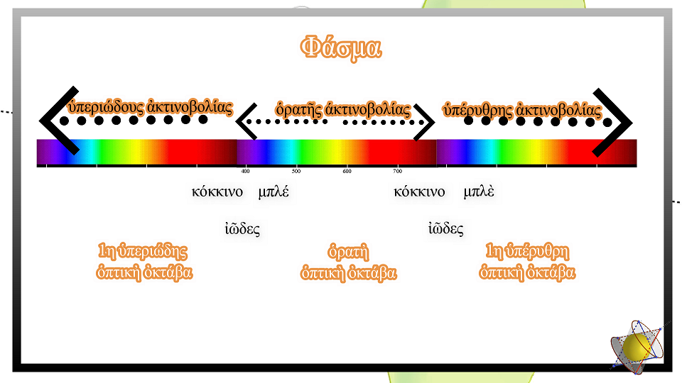 Ἐὰν παρατηρήσουμε τὸ φάσμα τῆς ἠλεκτρομαγνητικῆς ἀκτινοβολίας, θὰ δοῦμε ὅτι τὸ κάθε χρῶμα ἀντιστοιχεῖ καὶ σὲ συγκεκριμένη συχνότητα. Θὰ δοῦμε ἐπίσης ὅτι ἀπὸ τὸ ἕνα ἄκρο τοῦ φάσματος ἕως τὸ ἄλλο, ἡ συχνότητα σχεδὸν διπλασιάζεται. Αὐτοὶ ὅμως εἶναι βασικοὶ κανόνες τῆς μουσικῆς. Θὰ μπορούσαμε δηλαδή, κατὰ ἀντιπαράθεση νὰ μιλοῦμε γιὰ μία ἀντίστοιχη ὀπτικὴ ὀκτάβα.