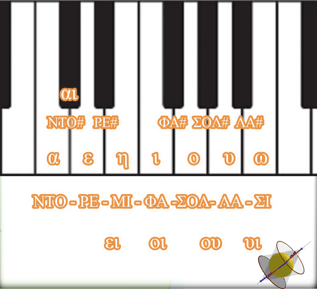 Ἂς ἐπιστρέψουμε ὅμως στὰ δίψηφα φωνήεντα καὶ στὶς διέσεις καὶ ἂς δοῦμε μέσα ἀπὸ τὰ πλῆκτρα ἑνὸς πιάνου, ποιὰ συμπεράσματα μποροῦν νὰ προκύψουν γιὰ τὸ πρῶτο δίψηφο φωνῆεν, τὸ αι. Ἀνάμεσα στὰ φωνήεντα ἂλφα καὶ ἰῶτα, δηλαδὴ ἀνάμεσα στὶς νότες Ντὸ καὶ Φὰ ὑπάρχουνε δύο κενὲς θέσεις, ἡ Ντὸ# καὶ ἡ Ρέ#. Ἡ μία ἀπὸ τὶς δύο θὰ ἀντιστοιχῆ καὶ στὸ δίψηφο φωνῆεν αι. Ποιά ὅμως θὰ εἶναι ἡ σωστὴ ἐπιλογή;