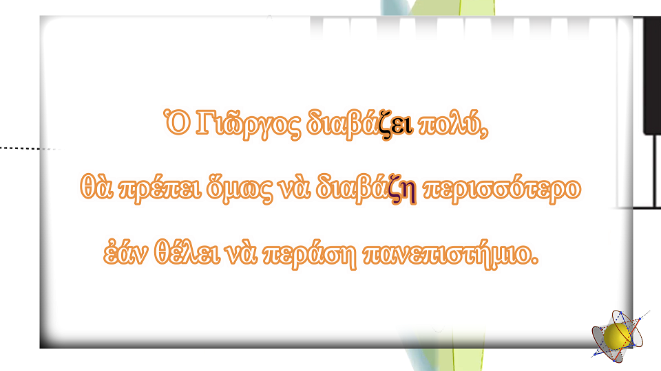 Ἂς δοῦμε ὅμως μέσα ἀπὸ ἕνα παράδειγμα γιὰ ποιὸ λόγο ὑπῆρχε αὐτὸς ὁ κανόνας. Λέμε τὴν πρόταση «Ὁ Γιῶργος διαβάζει πολύ, θὰ πρέπει ὅμως νὰ διαβάζη περισσότερο ἐὰν θέλη νὰ περάση πανεπιστήμιο.»