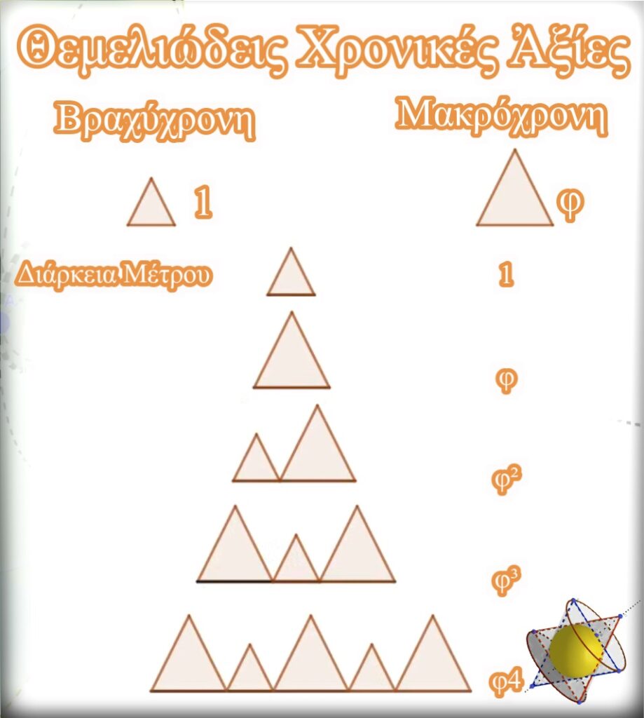 Ὅπως ἔχουμε ἤδη ἀναφέρει, στοὺς κατὰ φ μουσικοὺς ρυθμοὺς ὑπάρχουν δύο βασικὲς χρονικὲς ἀξίες. Ἐὰν ἡ διάρκεια τῆς βραχύχρονης θεωρηθῆ ἴση μὲ 1, τότε αὐτὴ τῆς μακρόχρονης θὰ εἶναι ἴση μὲ φ (1,618…)
