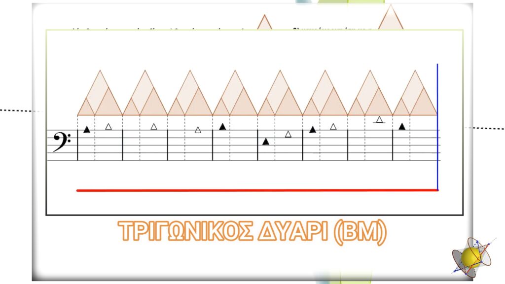 Ἐὰν προσθέσουμε τὰ δύο προηγούμενα μέτρα, δηλαδὴ τὸ μακρόχρονο βηματικὸ καὶ τὸ βραχύχρονο βηματικό, τότε θὰ προκύπτει ἕνα νέο μέτρο μὲ διάρκεια ἴση μὲ 2,618. Αὐτὴ ὅμως εἶναι ἡ τιμὴ τοῦ τρίτου ὅρου τῆς ἀκολουθίας φ, ἡ τιμὴ φ². Εἶναι ὁ ρυθμὸς ποὺ τὸ μέτρο του συμπληρώνεται ἐπακριβῶς μὲ μία βραχύχρονη καὶ μιὰ μακρόχρονη ἀξία. Εἶναι ὁ πιὸ ἁπλὸς κατὰ φ μουσικός ρυθμός. Ἡ διαφορετικὴ σειρὰ μὲ τὴν ὁποία θὰ ἐμφανίζονται ἡ μακρόχρονη καὶ ἡ βραχύχρονη ἀξία, κάθε φορὰ θᾶ μᾶς δίνει καὶ διαφορετικὴ παραλλαγὴ τοῦ ρυθμοῦ. Τοὺς ρυθμοὺς αὐτῆς τῆς ὁμάδας θὰ τοὺς ὀνομάσουμε τριγωνικοὺς δυάρι.