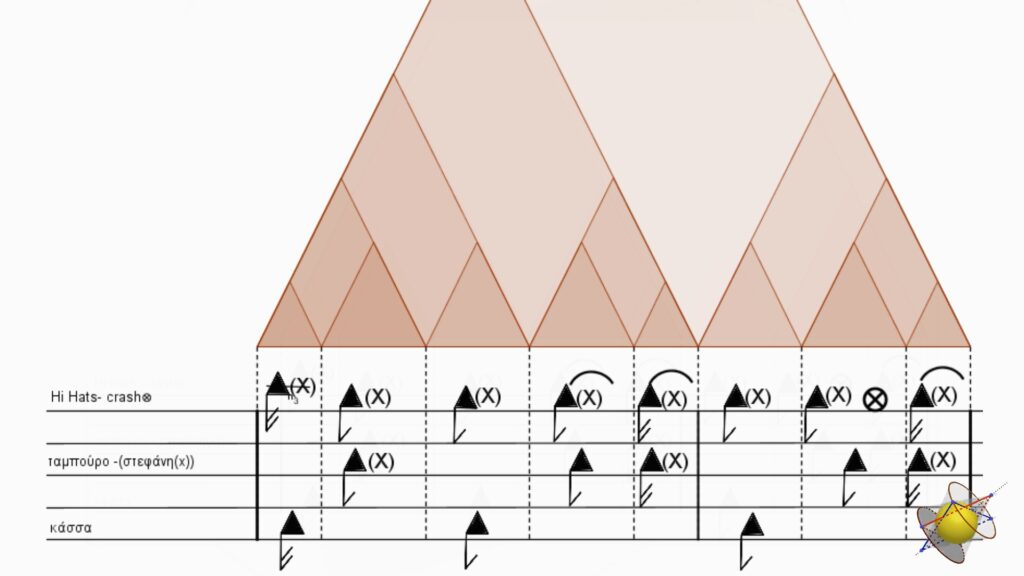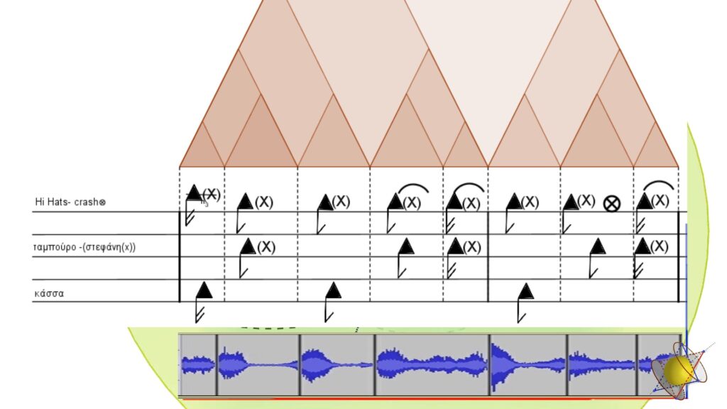 Ἔτσι ὅμως δημιουργήσαμε ἕναν πολὺ συγκεκριμένο τριγωνικὸ ὀχτάρι ρυθμὸ ἐπὶ χάρτου. Θὰ τὸν ζωντανέψουμε. Μὲ τὴ βοήθεια τῆς σύγχρονης μουσικῆς τεχνολογίας, ἐπενδύσαμε τὸ μέτρο μὲ ψηφιακοὺς ἤχους drums, ἄψογα παιγμένους μὲ τοὺς κανόνες καὶ τὶς ὑποδείξεις τοῦ συγκεκριμένου μέτρου.