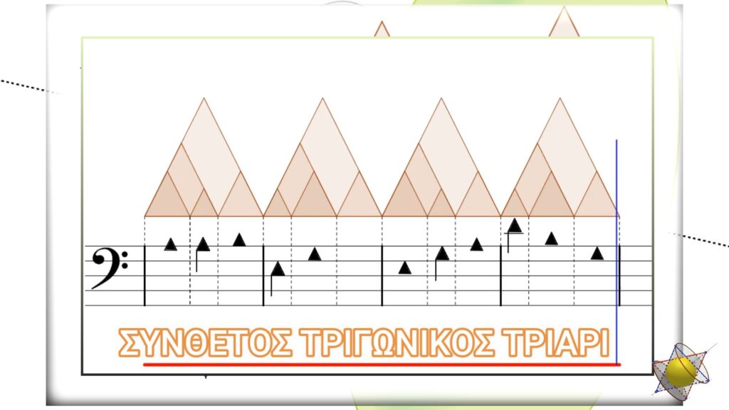 Γενικότερα τοὺς ρυθμοὺς τῆς κατηγορἰας, θὰ τοὺς ὀνομάζουμε τριγωνικοὺς καὶ θὰ τοὺς ἀποτυπώνουμε μὲ ἕνα χρυσὸ τρίγωνο, μέσα στο ὁποῖο θὰ ἐμφανίζονται μικρότερα χρυσὰ τρίγωνα, καὶ γιὰ νὰ τονίσουμε τὴν σημασία τῆς χρυσῆς τομῆς στὴν δημιουργία τους, ἀλλὰ καὶ γιὰ νὰ ἀποδόσουμε ὅσο γίνεται παραστατικότερα τὴν μορφὴ αύτῶν, καθῶς καὶ τὴν σειρὰ μὲ τὴν ὁποία θὰ ἐμφανίζονται οἱ μακρόχρονες καὶ οἱ βραχύχρονες ἀξίες στὸ μέτρο.