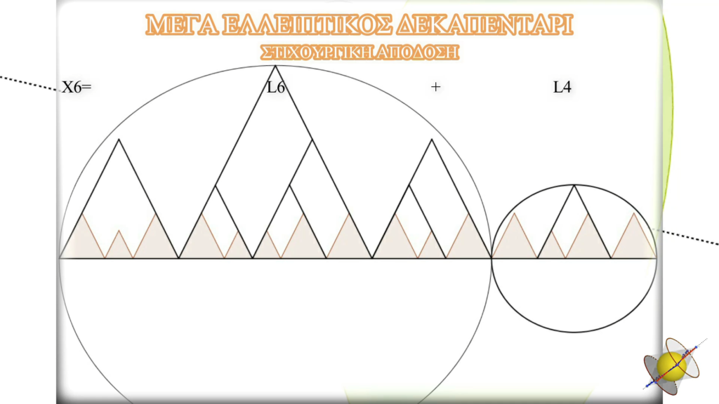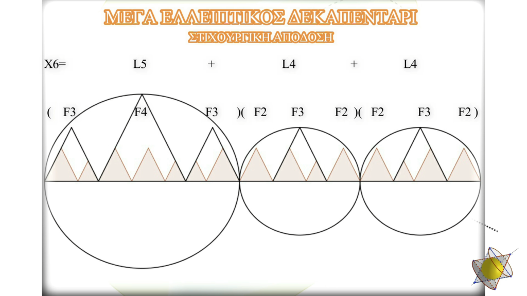 Παίρνουμε τρεῖς συνεχόμενους ὄρους τῆς σειρᾶς Lucas μαζὶ μὲ τοὺς ἀντίστοιχους ἐλλειπτικοὺς ρυθμούς, τὸν ἐλλειπτικὸ τριάρι, τὸν ἐλλειπτικὸ τεσσάρι καὶ τὸν ἐλλειπτικὸ ἑφτάρι ρυθμό. Ἐὰν τώρα στὸ ἐλλειπτικὸ ἑφτάρι ρυθμὸ προσθέσουμε τὸν πρὸ προηγούμενο του, δηλαδὴ τὸν ἐλλειπτικὸ τριάρι ρυθμό, τότε θὰ πάρουμε ἕναν νέο ρυθμό, ὁ ὁποῖος στὴν ἀρτιώτερη, τουλάχιστον σχεδιαστικά μορφή, θὰ μποροῦσε νὰ ἀποδοθῆ ἀπὸ μία μεγάλη ἔλλειψη μέσα στὴν ὁποία θὰ ἐμφανίζονται τρεῖς μικρότερες ἐλλείψεις.