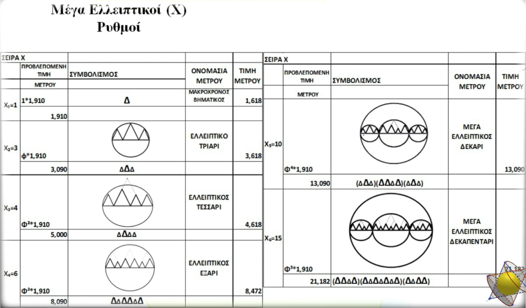 Φυσικά, ἡ κάθε ἐπιμέρους ἔλλειψη, ρυθμικὰ θὰ μποροῦσε νὰ ἀποδοθῆ μὲ τρεῖς συγκεκριμένους τριγωνικοὺς ρυθμούς. Γιὰ αὐτό, τοὺς ρυθμοὺς τῆς κατηγορίας θὰ τοὺς ὀνομάσουμε Μέγα Ἐλλειπτικοὺς Ρυθμούς. Θὰ τοὺς ὀνομάσουμε ὅμως καὶ Χ ρυθμούς, γιὰ νὰ τονίσουμε τὴν σημασία τῆς σειρᾶς Χ στὴν δημιουργία τους. Στὸν πίνακα ποὺ ἀκολουθεῖ βλέπουμε συγκεντρωτικὰ τὶς πρῶτες ὁμάδες τῶν μέγα ἐλλειπτικῶν ρυθμῶν.