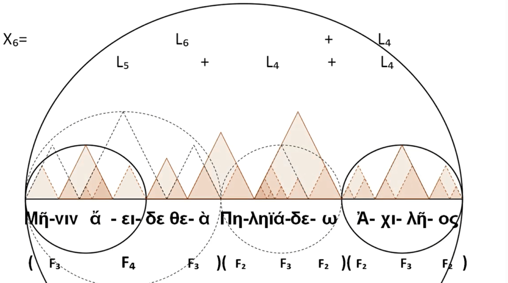Ὑπάρχει ὅμως καὶ ἕνας νοηματικὸς διαχωρισμὸς τοῦ στίχου σὲ τμήματα, τὰ ὁποία ἀντιστοιχοῦν στοὺς ἐπιμέρους ρυθμοὺς τοῦ μέτρου. Ἔτσι, ἔχουμε τὴν κύρια πρόταση «μῆνιν ἄειδε θεά», ἡ ὁποία μὲ τὴν παρουσία της καλύπτει τὸν πρῶτο L₅ ρυθμό. Μάλιστα, οἱ τρεῖς λέξεις ποὺ ἀποτελοῦν τὴν πρόταση, ἐμφανίζονται μὲ τὸν κατάλληλο ἀριθμὸ συλλαβῶν καὶ μὲ τὴν κατάλληλη σειρά, ἔτσι ὥστε νὰ μπορέσουν νὰ πλαισιώσουν σωστὰ τοὺς τρεῖς ἐπιμέρους τριγωνικοὺς ρυθμοὺς τοῦ L₅ ρυθμοῦ μας. Ὁ προσδιορισμὸς «Πηληιάδεω» καλύπτει τὸν πρῶτο ἀπὸ τοὺς δύο L₄ ρυθμοὺς καὶ ἡ λέξη «Ἀχιλῆος» τὸν δεύτερο.