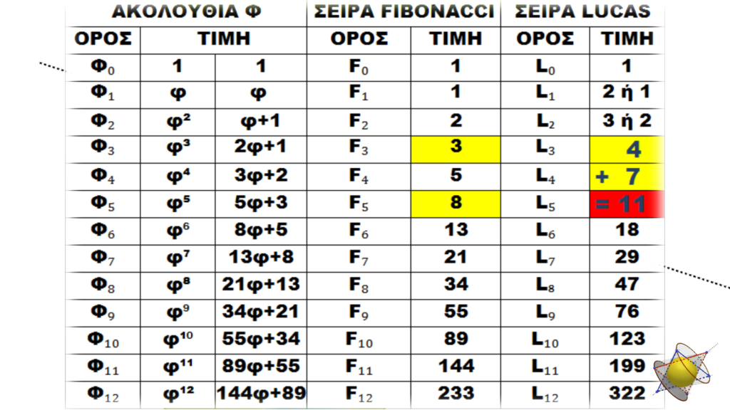 Ἐὰν ὅμως στὸν κάθε ὅρο τῆς σειρὰς Fibonacci προσθέσουμε τὸν προ-προηγούμενο ὅρο της, τότε σχηματίζεται μία ἄλλη σειρὰ ἀριθμῶν, γνωστὴ σὰν σειρὰ Lucas. Ἂς δοῦμε καταρχὴν τὸν παρακάτω πίνακα.