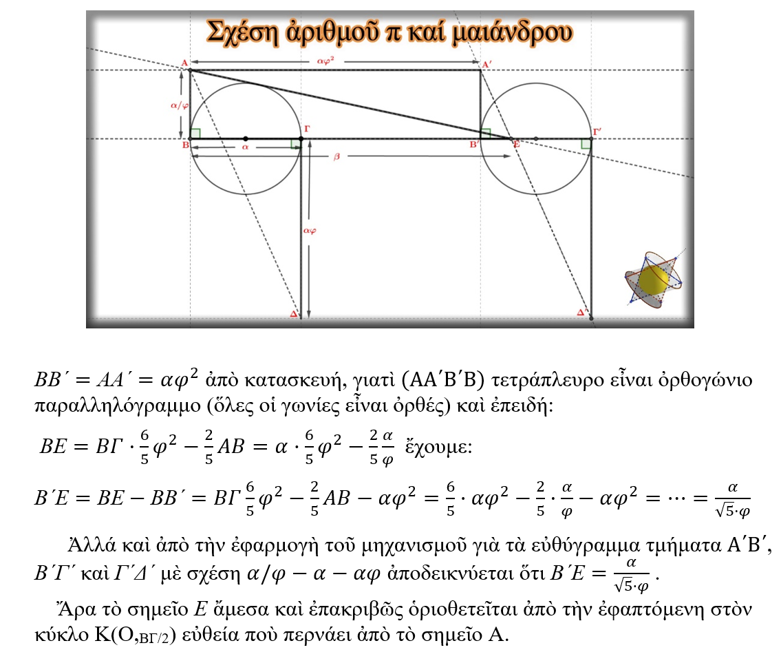 Ἐμφατικὰ λοιπόν βλέπουμε πὼς ὁ ἴδιος ὁ κύκλος, μὲ ἀποδοχὴ τῆς τιμῆς τοῦ ἀριθμοῦ πφ ποὺ προκύπτει ἀπὸ τὸν μηχανισμό, μᾶς δίνει τὴν περίμετρο του καὶ ταυτόχρονα μᾶς ὁρίζει ἀπόλυτα ἀνάπτυξη «ἁρμονικοῦ» μαιάνδρου, γιατὶ τὰ εὐθύγραμμα τμήματα τοῦ μαιάνδρου ποὺ προέκυψε, ἀκολουθοῦν τὴν ἀκολουθία τοῦ ἀριθμοῦ φ.
