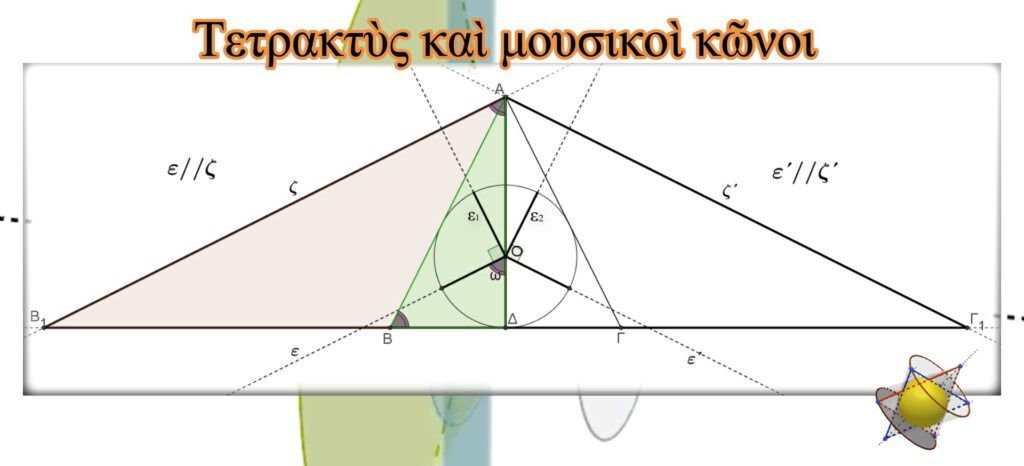 Οἱ δύο κάτω ἀκτίνες τῆς Τετρακτύος (Ο,ε καὶ Ο, ε΄) ἐμφατικὰ μᾶς καθορίζουν τὸν μουσικὸ κῶνο 2. Ἀπὸ τὴν κορυφὴ Α τῆς Τετρακτύος φέρνουμε εὐθεῖες παράλληλες μὲ τὶς δύο ἀκτίνες (ζ//ε καὶ ζ΄//ε΄). Αὐτὲς τέμνουν τὴν εὐθεία ποὺ ὁρίζεται ἀπὸ τὴν βάση τῆς Τετρακτύος στὰ σημεῖα Β1 καὶ Γ1 ἀντίστοιχα. Ἀπὸ τὴν ὁμοιότητα τῶν τριγώνων ΑΒΔ καὶ Β1ΑΔ( ὀρθογώνια τρίγωνα καὶ ΑΒ ̂Δ=Β1Α ̂Δ=ω ̂ ), καθὼς καὶ ἀπὸ τὸν λόγο ΑΔ/ΔΒ=2/1, ἀποδεικνύεται ὅτι Β1Δ=2ΑΔ. Ἔτσι τὸ τρίγωνο ΑΒ1Γ1 , μὲ ἁπλὴ περιστροφὴ γύρω ἀπὸ τὸν ἄξονα συμμετρίας του ΑΔ, δημιουργεῖ τὸν μουσικὸ κῶνο 2.