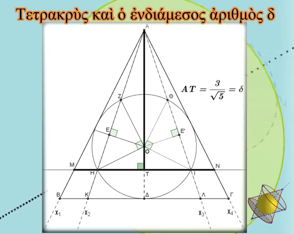 Τὰ σημεῖα Η καὶ Ι τῶν δύο κάτω ἀκτινῶν τῆς Τετρακτύος ὁρίζουν εὐθεία κάθετη στὸ ὕψος ΑΔ τοῦ Χρυσοῦ Τριγώνου, ἡ ὁποία τὸ τέμνει στὸ σημεῖο Τ.