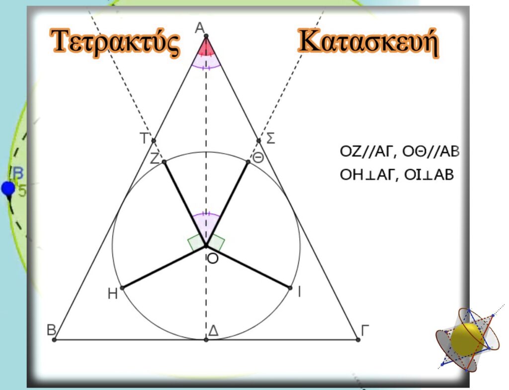 Σκοπὸς μας εἶναι νὰ φέρουμε τέσσερεις συγκεκριμένες ἀκτίνες, κατ’ ὑπόδειξη καὶ τῆς λέξης «Τετρακτύς», μὲ κορυφὴ τὸ κέντρο τοῦ μοναδιαίου κύκλου, τὸ ὁποῖο εἶναι ἐγγεγραμμένο στὸ Χρυσὸ Τρίγωνο. Αὐτὲς θὰ εἶναι ἡ ΟΖ ἀκτίνα, παράλληλη μὲ τὴν πλευρὰ ΑΓ, ἡ ΟΗ, κάθετη μὲ τὴ πλευρὰ ΑΓ καὶ ἀντίστοιχα οἱ ΟΘ καὶ ΟΙ. Ἔτσι σχηματίζονται οἱ ὀρθὲς γωνίες ΖΟΗ καὶ ΘΟΙ. Προεκτείνουμε τὶς ἀκτίνες ΟΖ καὶ ΟΘ. Οἱ ἡμιευθείες ποὺ σχηματίζονται τέμνουν τὶς πλευρὲς ΑΒ καὶ ΑΓ τοῦ τριγώνου στὰ σημεῖα Τ καὶ Σ ἀντίστοιχα. Τὸ τετράπλευρο (ΑΤΟΣ) ποὺ σχηματίζεται πέρα ἀπὸ παραλληλόγραμμο (ἀπέναντι πλευρὲς παράλληλες ἀπὸ κατασκευή), εἶναι καὶ ρόμβος (ἡ διαγώνιος ΑΟ διχοτομεῖ τὴν γωνία Α). Ἔτσι ΖΟ ̂Θ=ΒΑ ̂Γ σὰν ἀπέναντι γωνίες παραλληλογράμμου. Ἐπίσης καὶ ΗΟ ̂Ι=Β ̂+Γ ̂ γιατὶ
