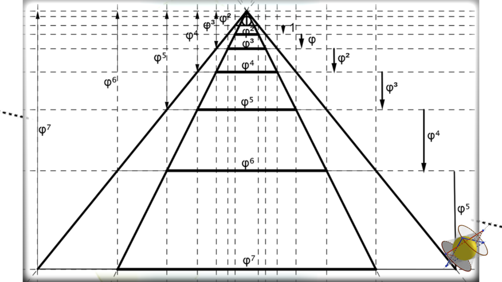 Τὸ ὕψος τῆς πυραμίδας τοῦ Χέοπα ἔχει μετρηθεῖ καὶ ἔχει βρεθεῖ ὅτι εἶναι 147,65 μ. Ἔτσι καὶ ἡ βάση τοῦ Χρυσοῦ τριγώνου Β1Γ1 θὰ εἶναι ἐπίσης 147,65 μ. Εἴδαμε στὴν ἀνάπτυξη τοῦ μηχανισμοῦ δευτέρου σταδίου ὅτι, κάθε φορὰ ποὺ προχωρούσαμε στὸ ἑπόμενο ἐπίπεδο, ἡ βάση τοῦ νέου Χρυσοῦ τριγώνου αὐξάνονταν κατὰ φ φορές. Αὐτὴ ἡ διαδικασία μάλιστα μᾶς ἐμφάνισε καὶ τὴν θεμελιώδη μουσικὴ κλίμακα. Στὴν περίπτωση μας θὰ ἐργαστοῦμε ἀντίστροφα. Θὰ ξεκινήσουμε ἀπὸ τὴ βάση καὶ θὰ ἀνεβαίνουμε πρὸς τὴν κορυφὴ τῆς πυραμίδας. Κάθε φορά, τὸ μῆκος τοῦ νέου ἐπιπέδου (ὀρόφου) θὰ εἶναι μικρότερο τοῦ προηγουμένου κατὰ φ φορές.