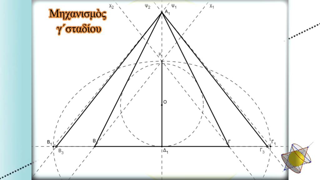 Ἡ κατακόρυφη τομὴ τῆς πυραμίδας, ἡ ὁποία διέρχεται ἀπὸ τὴν κορυφὴ της καὶ τέμνει κάθετα τὶς δύο ἀπέναντι πλευρὲς τῆς βάσης της, ταυτίζεται μὲ τὸ σχέδιο τοῦ τρίτου σταδίου ἐξέλιξης τοῦ μηχανισμοῦ μας. Μὲ τὴν ἐμφάνιση τῆς πυραμίδας, θὰ πρέπει νὰ δεχθοῦμε ὅτι ἀπὸ τὸ σχέδιο τῶν δύο διαστάσεων τοῦ μηχανισμοῦ, περνᾶμε πλέον στὶς τρεῖς διαστάσεις, στὸν χῶρο. Ἐπίσης, ἂν καὶ δὲν φαίνεται, στὴν πυραμίδα πρέπει νὰ ἐμπεριέχονται καὶ τὰ δύο προηγούμενα στάδια τοῦ μηχανισμοῦ τὰ ὁποῖα ὅπως εἴδαμε, εἶναι ἀπαραίτητα γιὰ νὰ φτάσουμε στὸ τρίτο στάδιο.