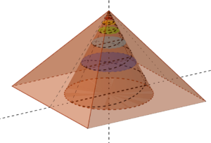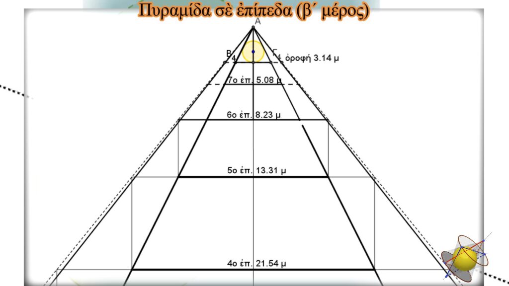 Παρατηροῦμε ὅτι μετὰ ἀπὸ ὀκτὼ ἐπαναλήψεις καταλήγουμε στὸ ὄγδοο ἐπίπεδο, τὴν ὀροφὴ τῆς πυραμίδας μὲ τιμὴ ἴση μὲ 3,14 μ. δηλαδὴ ἴση μὲ τὴν τιμὴ τοῦ ἀριθμοῦ π. Φαίνεται λοιπὸν ὅτι οἱ κατασκευαστὲς τῆς μεγάλης πυραμίδας, σὰν βάση καὶ μέτρο σχεδιασμοῦ της, χρησιμοποίησαν τὸν ἀριθμὸ π. Ἐπίσης, μὲ τὴν κατασκευὴ αὐτή, μᾶς ὑπέδειξαν καὶ τὴν τιμὴ τοῦ ἀριθμοῦ π, ἡ ὁποία σὰν μέγεθος ἰσοῦται μὲ τὴν περίμετρο τοῦ μοναδιαίου κύκλου καὶ εἶναι 3,14 μέτρα.