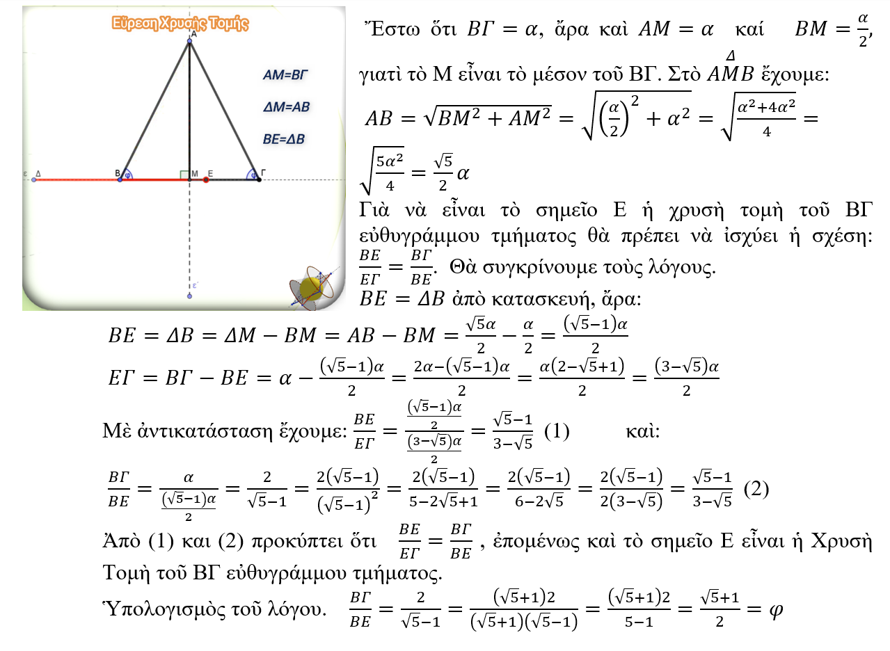 Ἀποδεικνύεται (ἐδῶ) πὼς τὸ σημεῖο Ε ἀποτελεῖ τὴ χρυσὴ τομὴ τοῦ εὐθυγράμμου τμήματος ΒΓ.