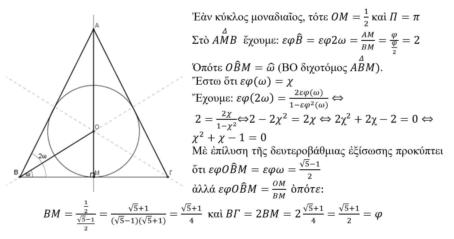 Ἐὰν μάλιστα θεωρήσουμε ὅτι εἶναι ἴση μὲ τὴ μονάδα ἡ διάμετρος τοῦ ἐγγεγραμμένου σὲ αὐτὸ κύκλου, τότε ἀποδεικνύεται (ἐδῶ) πὼς ἡ βάση τοῦ τριγώνου εἶναι ἴση μὲ τὸν ἀριθμὸ φ, ἀλλὰ καὶ ἡ περίμετρος τοῦ κύκλου εἶναι ἴση μὲ τὸν ἀριθμὸ π.
