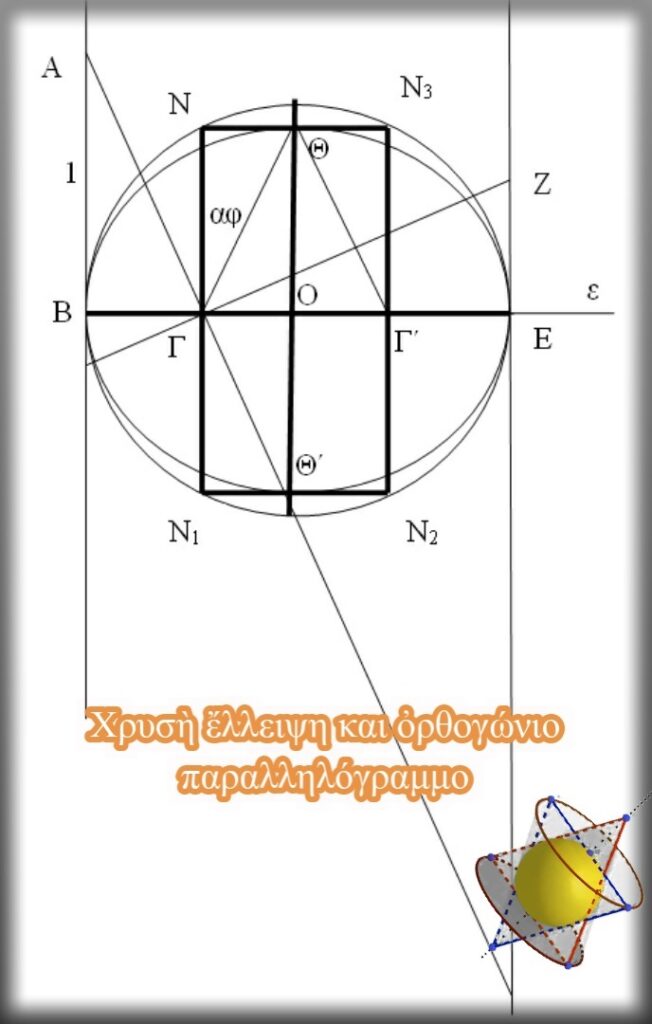 Δύο συνεχόμενα σὲ εὐθεία εὐθύγραμμα τμήματα μποροῦν νὰ ὁρίσουν ἀπόλυτα μία ἔλλειψη μὲ μεγάλο ἄξονα ἴσο μὲ τὸ ἄθροισμα τῶν δύο εὐθυγράμμων τμημάτων καὶ μικρὸ ἄξονα ἴσο μὲ τὸ διπλάσιο τῆς τετραγωνικῆς ρίζας τοῦ γινομένου τους («ΓΕΩΜΕΤΡΙΚΕΣ ΚΑΤΑΣΚΕΥΕΣ ΣΤΟ Πὶ ΚΑΙ Φὶ» κεφ.2). Ἄρα, στὴν συγκεκριμένη περίπτωση, ἂν ἀπὸ τὸ σημεῖο Ο φέρουμε κάθετη στὴν εὐθεία ε καὶ ὁρίσουμε τὸ ΟΘ εὐθύγραμμο τμῆμα ἴσο μὲ τὸ ΟΘ΄ εὐθύγραμμο τμῆμα , ἴσο μὲ τὸ ΓΝ , τότε ἔχουμε ὁρίσει ἔλλειψη μὲ μεγάλο ἄξονα τὸ ΒΕ εὐθύγραμμο τμῆμα, μικρὸ ἄξονα τὸ ΘΘ΄ καὶ ἑστίες τῆς ἔλλειψης τὰ σημεῖα Γ καὶ Γ΄ ὅπου ΒΓ=Γ΄Ε.