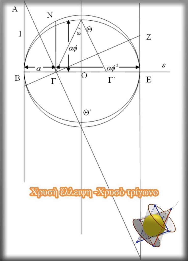 Ἀπὸ τὶς παραπάνω σχέσεις προκύπτει πὼς τὸ ὕψος ΘΟ τοῦ ἰσοσκελοῦς τρίγωνο ΓΘΓ΄, ποὺ σχηματίζεται στὴν συγκεκριμένη ἔλλειψη, εἶναι ἴσο μὲ τὴ βάση του ΓΓ΄, δηλαδὴ τῆς ἀπόστασης τῶν δύο ἑστιῶν τῆς ἔλλειψης καὶ μάλιστα εἶναι καὶ ὁ γεωμετρικὸς μέσος τῶν ΒΓ καὶ ΓΕ εὐθυγράμμων τμημάτων. (Ἐμφάνιση τοῦ ΧΡΥΣΟΥ ΤΡΙΓΩΝΟΥ)