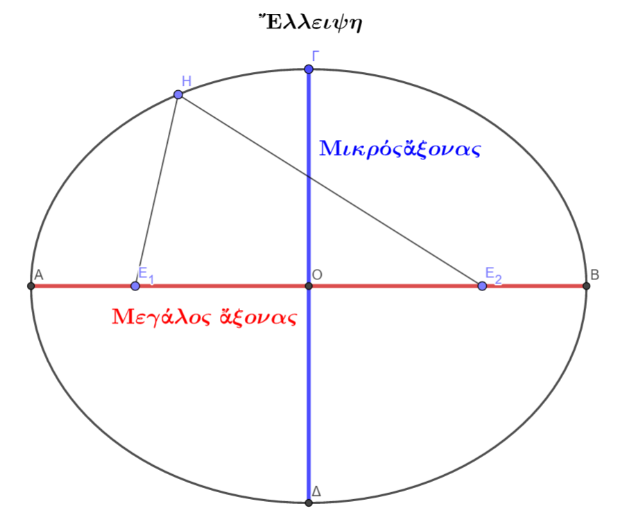 Ἔλλειψη ὀνομάζεται ὁ γεωμετρικὸς τόπος (τὸ σύνολο) τῶν σημείων ἑνὸς ἐπιπέδου τῶν ὁποίων τὸ ἄθροισμα τῶν ἀποστάσεων ἀπὸ δύο σημεῖα τοῦ ἐπιπέδου εἶναι σταθερὸ καὶ ἰσοῦται μὲ τὸν μεγάλο ἄξονα τῆς ἔλλειψης.