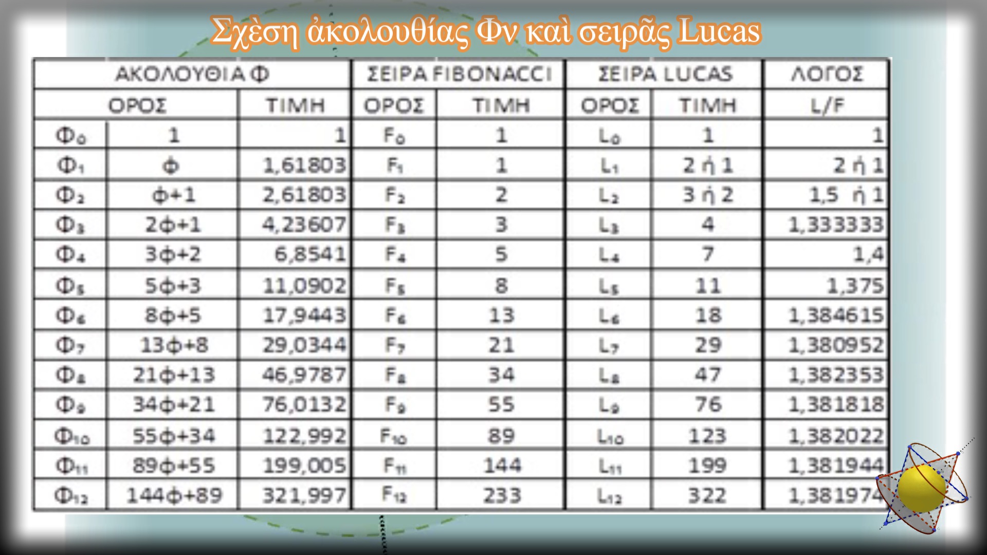 Εἴδαμε ὅτι ἡ σειρὰ Lucas στὴν οὐσία εἶναι ἡ ἀκολουθία τοῦ ἀριθμοῦ Φ στρογγυλοποιημένη. Ἐπίσης, εἴδαμε ὅτι ἀπὸ τὴ σειρὰ Lucas θὰ μπορούσαμε νὰ μεταπηδήσουμε στὴ σειρὰ Fibonacci (ἐδῶ) διαιρώντας τὴν τιμὴ τοῦ κάθε ὅρου της μὲ τὸν ἀριθμὸ