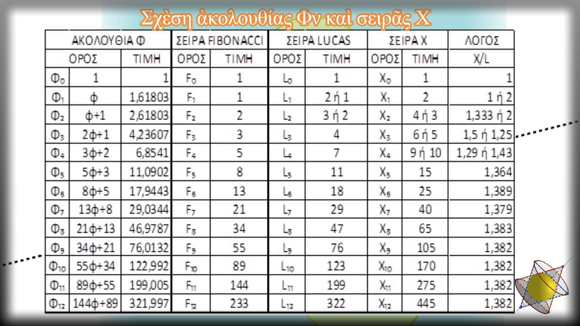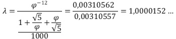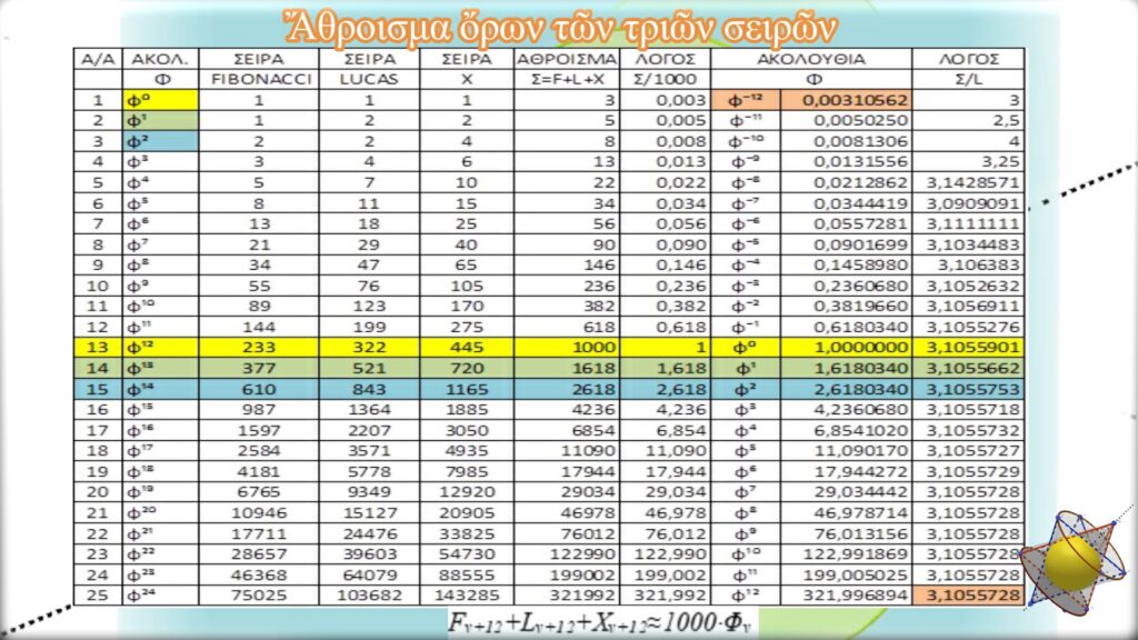 Σὲ κάθε σειρὰ τοῦ πίνακα βρίσκουμε τὸ λόγο τοῦ ἀθροίσματος τῶν ὅρων τῶν τιμῶν τῶν τριῶν σειρῶν (Σν=Fν+Lν+Χν) πρὸς τὴν τιμὴ τοῦ ἀντίστοιχου ὅρου τῆς σειρὰς Lucas, Σν/Lν. Παρατηροῦμε ὅτι ὅσο προχωροῦμε, τόσο ὁ λόγος αὐτὸς τείνει στὴν τιμὴ 3,10557… Ἡ τιμὴ ὅμως αὐτή, ἐὰν διαιρεθεῖ μὲ τὸν ἀριθμὸ 1000, μᾶς δείχνει τὴν τιμὴ τοῦ ὅρου φ-12≈0,00310562… Ἴσως λοιπόν, ὁ ὅρος φ-12 νὰ μπορεῖ νὰ θεωρηθεῖ σὰν ὁ μικρότερος μὲ ὑπολογιστικὴ ἀξία ὅρος, ὁ ὁποῖος καὶ νὰ ἔχει μετρήσιμο νόημα σὲ ἕνα ἐξελικτικὸ φαινόμενο. Ἂς δεχθοῦμε αὐτὴν τὴν προτροπὴ ὡς ἀποδεκτὴ καὶ ἂς δοῦμε ποὺ θὰ μᾶς ὁδηγήσει.