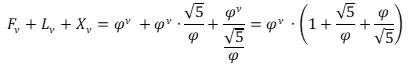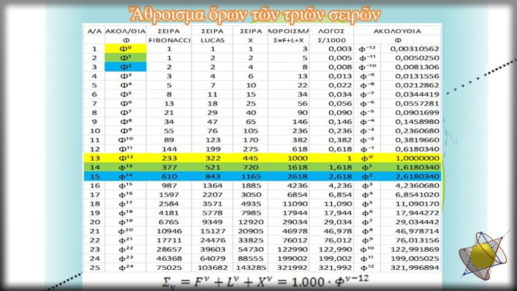 Ξεκινοῦμε παίρνοντας σὰν ἀφετηρία τὸν ὅρο Φ0=1 τῆς ἀκολουθίας Φν. Μετὰ ἀπὸ 12 (δώδεκα) ἐξελικτικὰ βήματα, φτάνουμε στὸν ὅρο Φ12. Παρατηροῦμε ὅτι τὸ ἄθροισμα τῶν τιμῶν τῶν τριῶν ὅρων τῶν ἀντίστοιχων σειρῶν (F12+L12+X12) εἶναι ἴσο μὲ 1.000. Πρόκειται γιὰ μία τιμὴ ποὺ κεντρίζει τὸ ἐνδιαφέρον καὶ μόνο λόγο τῆς ἀκεραιότητας της. Εἶναι μία τιμὴ κατὰ χίλιες φορὲς μεγαλύτερη ἀπὸ τὴν τιμὴ τοῦ πρώτου ὅρου φ0=1. Γιὰ νὰ τὸ διερευνήσουμε, στὴν ἑπόμενη στήλη διαιροῦμε τὸ ἑκάστοτε ἄθροισμα μὲ τὸν ἀριθμὸ 1.000, ἔτσι ὥστε νὰ μπορέσουμε νὰ βγάλουμε τὰ ὅποια συμπεράσματα.