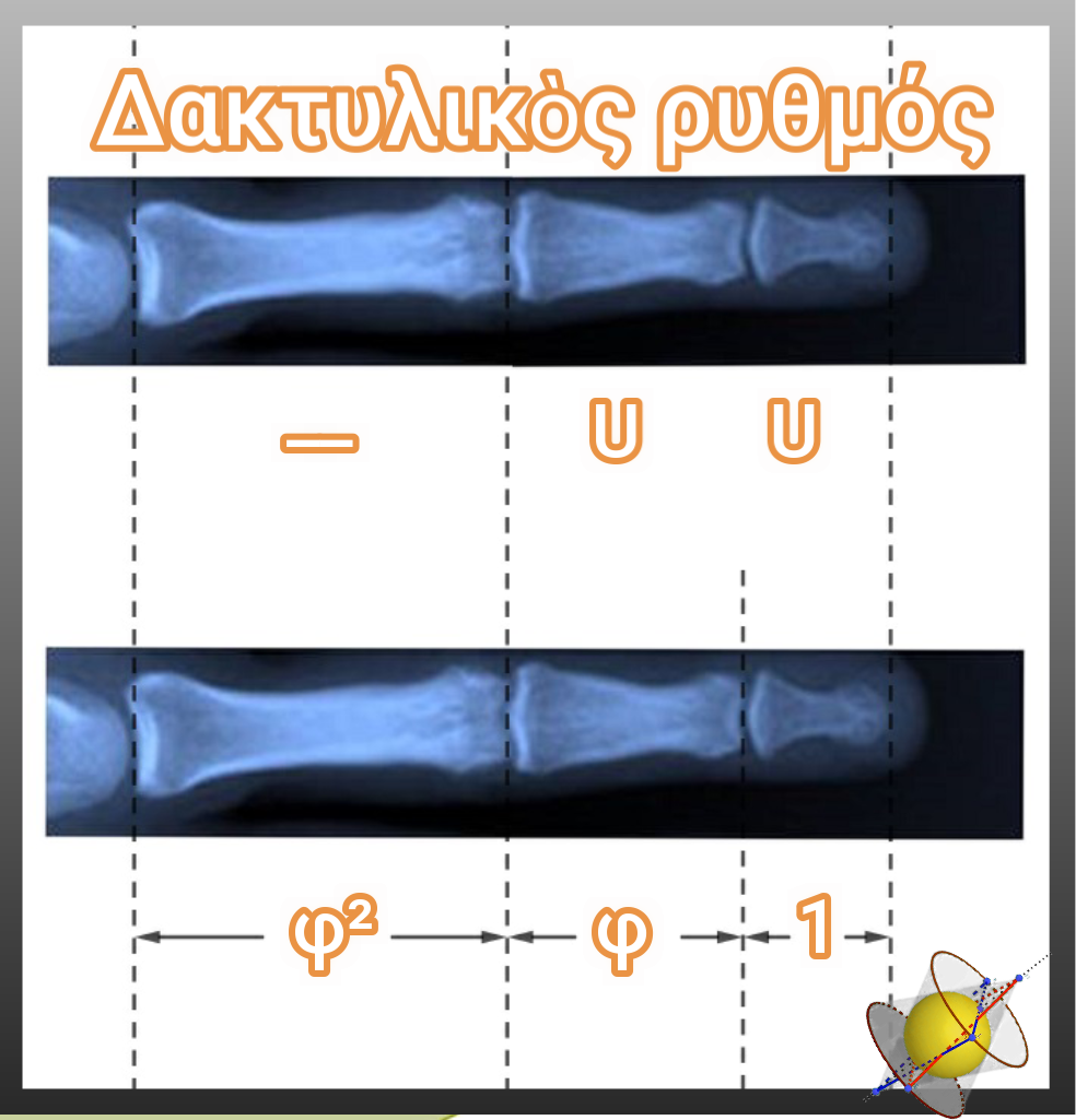 Εἴδαμε ὅτι ὁ δάκτυλος ἀποτελεῖται ἀπὸ τρία ὀστά, τὶς φάλαγγες. Ἀποτελεῖται ἀπὸ μία φάλαγγα μὲ τὸ μεγαλύτερο μῆκος καὶ ἀπὸ δύο μικρότερες, ποὺ τὸ μῆκος τους μαζὶ εἶναι ὅσο τῆς μεγαλύτερης. Ἔτσι ὑποθέσαμε ὅτι ἡ μεγάλη φάλαγγα  ἀντιστοιχεῖ σὲ μακρόχρονη συλλαβὴ ἐνῶ οἱ δύο μικρότερες φάλαγγες ἀντιστοιχοῦν σὲ δύο ἴσες σὲ διάρκεια βραχύχρονες συλλαβές. Ἔτσι ἑρμηνεύσαμε τὴ λέξη «δακτυλικὸς»  καὶ ἔτσι προσπαθήσαμε νὰ δώσουμε ρυθμὸ στὰ ὁμηρικὰ ἔπη, κάποιες φορὲς μὲ ἐπιτυχία, κάποιες φορὲς πάλι ὄχι, ὁπότε μὲ συμψηφισμούς, συγκερασμοὺς καὶ ἁπλουστεύσεις θελήσαμε νὰ προσαρμόσουμε τοὺς στίχους στοὺς κανόνες ποὺ ἐμεῖς θέσαμε μεταγενέστερα. Εἶναι φανερὸ ὅτι κάτι δὲν κάναμε σωστά! Τὸ λάθος μας ἦταν στὸ μέτρημα τῶν φαλάγγων ὅπου θεωρήσαμε ὅτι οἱ δύο μικρότερες φάλαγγες εἶναι ἴσες μεταξὺ τους. Εἶναι κάτι ποὺ καὶ μὲ ἁπλὴ παρατήρηση φαίνεται ὅτι δὲν εἶναι σωστό. Εἴπαμε ὅτι ἡ ἑλληνικὴ γλώσσα εἶναι γλώσσα δεικτικὴ ἀλλὰ καὶ μαθηματική. Ἐὰν ἤθελε νὰ μᾶς πεῖ ὅτι ὁ ρυθμὸς στὰ ὁμηρικὰ ἔπη εἶναι μακρύς-βραχύς-βραχύς (δεύτερο-τέταρτο-τέταρτο), θὰ μᾶς τὸ ἔλεγε μὲ διαφορετικὸ τρόπο, κατανοητὸ καὶ ἀπόλυτο.