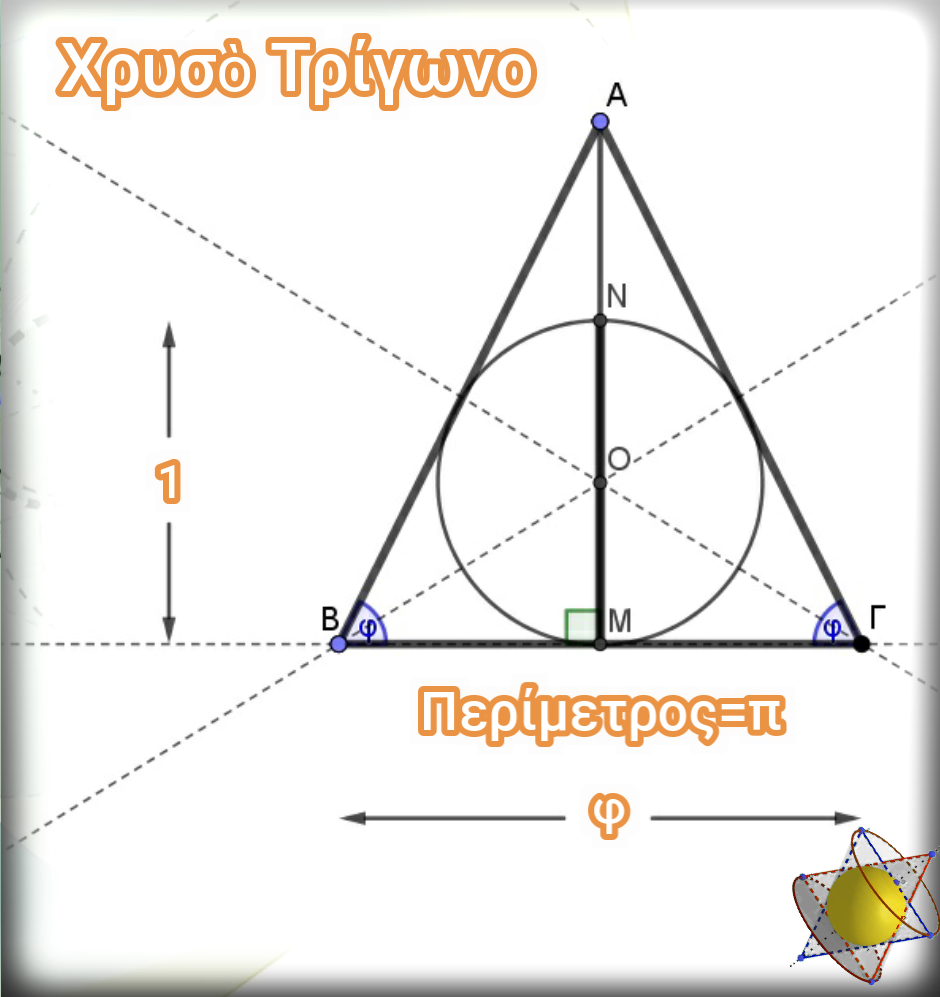 Ἂς θυμηθοῦμε πάλι τὸ Χρυσὸ Τρίγωνο, ὅπου ΑΜ=ΒΓ=φ. Ἐπειδὴ τὸ τρίγωνο εἶναι καὶ ἰσοσκελές, ἔχουμε ὅτι: ΒΜ=φ/2 καὶ ΑΒ=√5·φ/2.