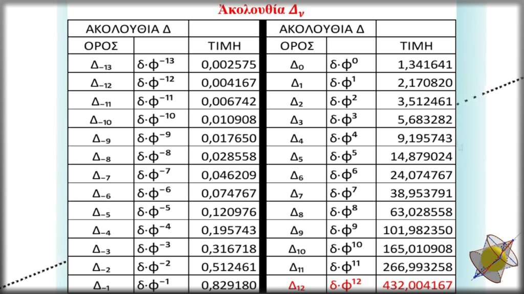 Εἶναι ἐμφανὲς καὶ ἀναμενόμενο πὼς καὶ ἡ ἀκολουθία Δ ἀκολουθεῖ τοὺς γενικώτερους κανόνες τῆς ἀκολουθίας Φ. Μεγάλο ἐνδιαφέρον ἔχει ἡ τιμὴ τοῦ 12ου ὅρου. Μάλιστα ἂν ἀπὸ αὐτὴν ἀφαιρέσουμε τὴν τιμὴ τοῦ ὅρου Δ-12 , (ὅπως συμβαίνει καὶ μὲ τὴν ἀκολουθία Φ), τότε παίρνει τὴν ἀκέραια τιμὴ 432.